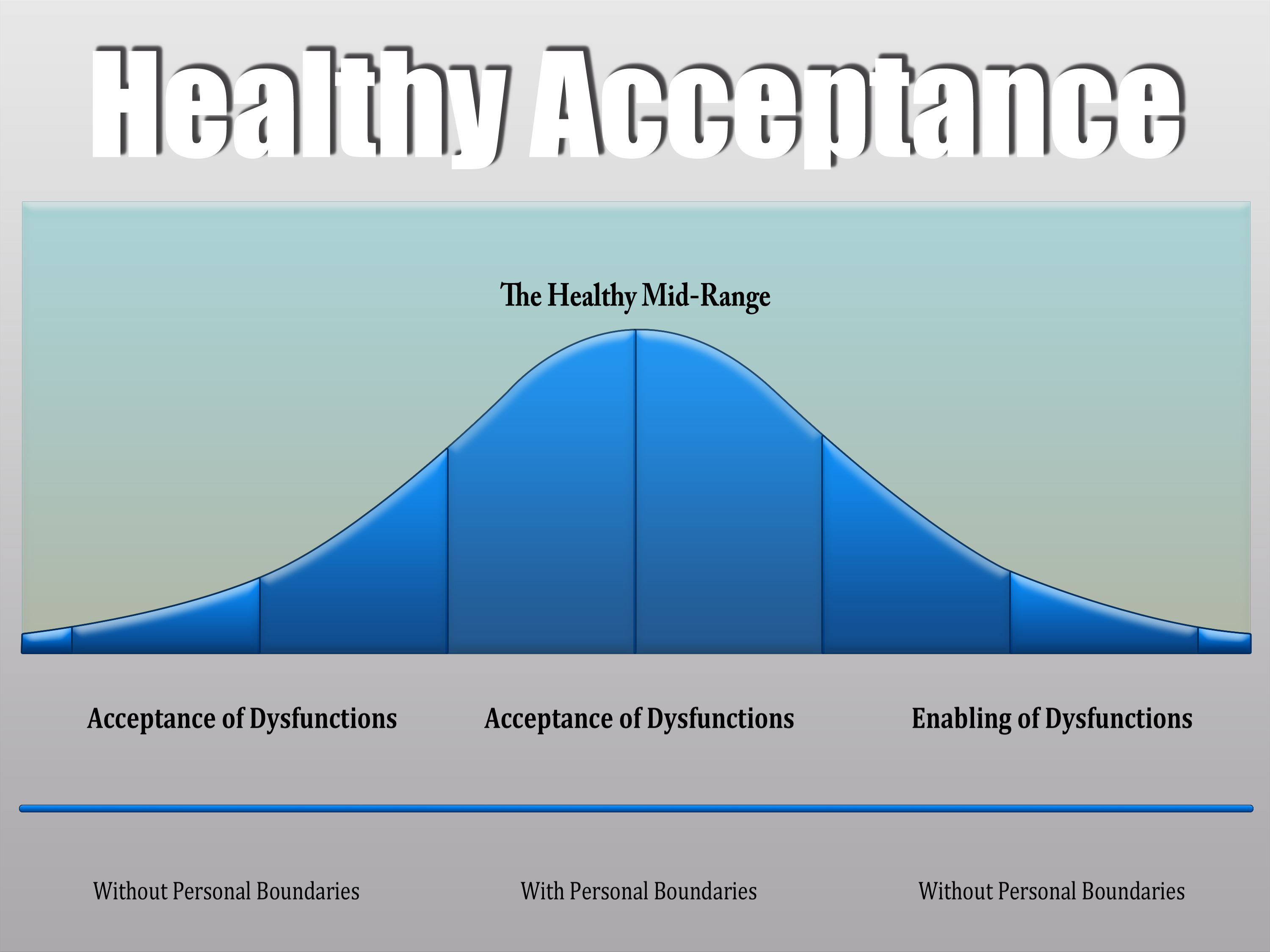 “Healthy Acceptance” is found in the middle. It’s where I understand we all have dysfunctions, but I don’t allow you to act out your dysfunctions on me. I have personal boundaries that I put up to protect me. That’s my right as an individual. Anything else ends up being toxic.