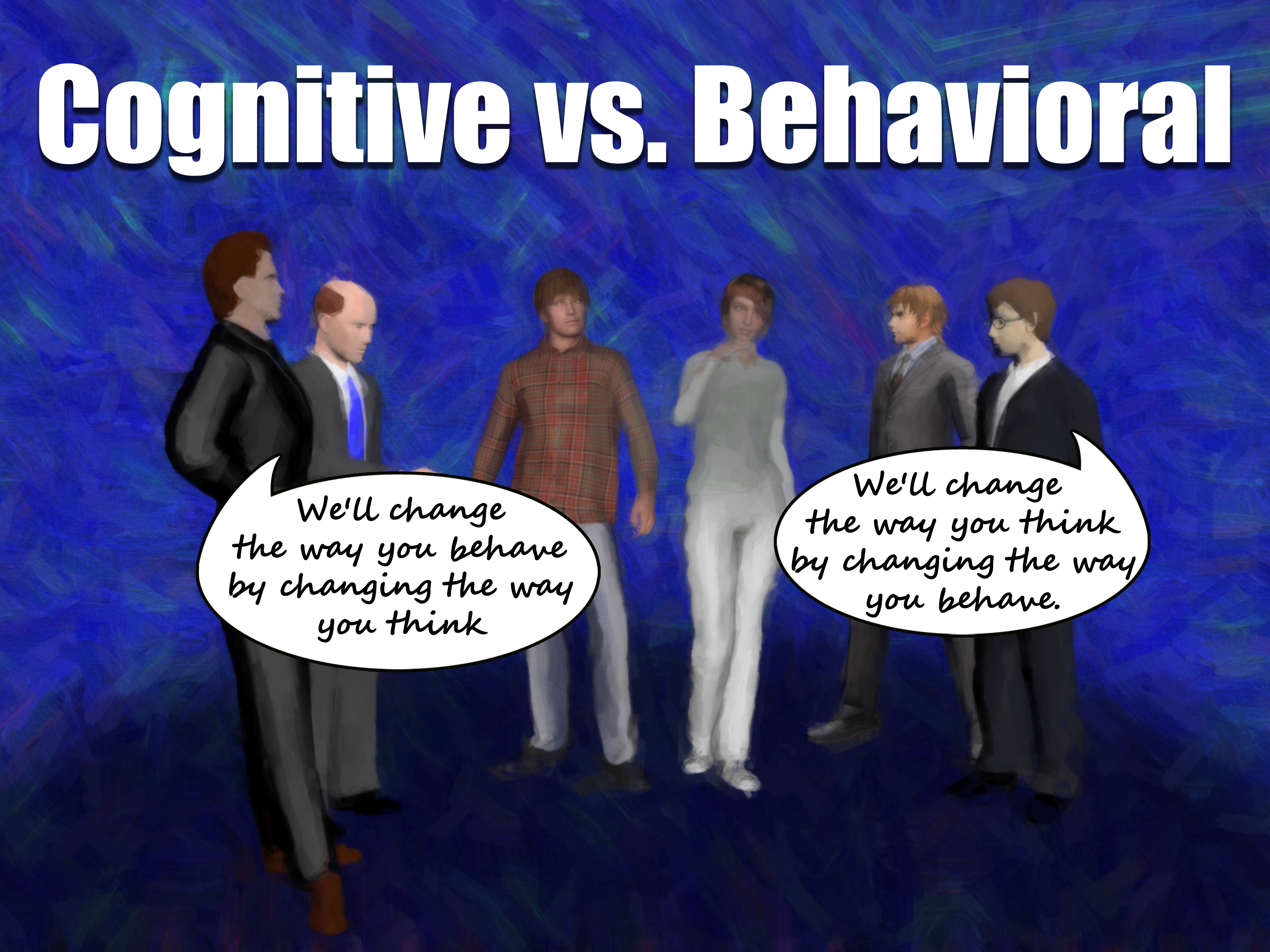 Psychologists tend to fall into one of two camps. You’ll see a couple standing in the middle of this poster and one group of psychologists are saying to them, “We’ll change the way you behave by changing the way you think.” They’re the cognitive psychologists. The other group is saying to them, “We’ll change the way you think by changing the way you behave.” They’re the behavioral psychologists.