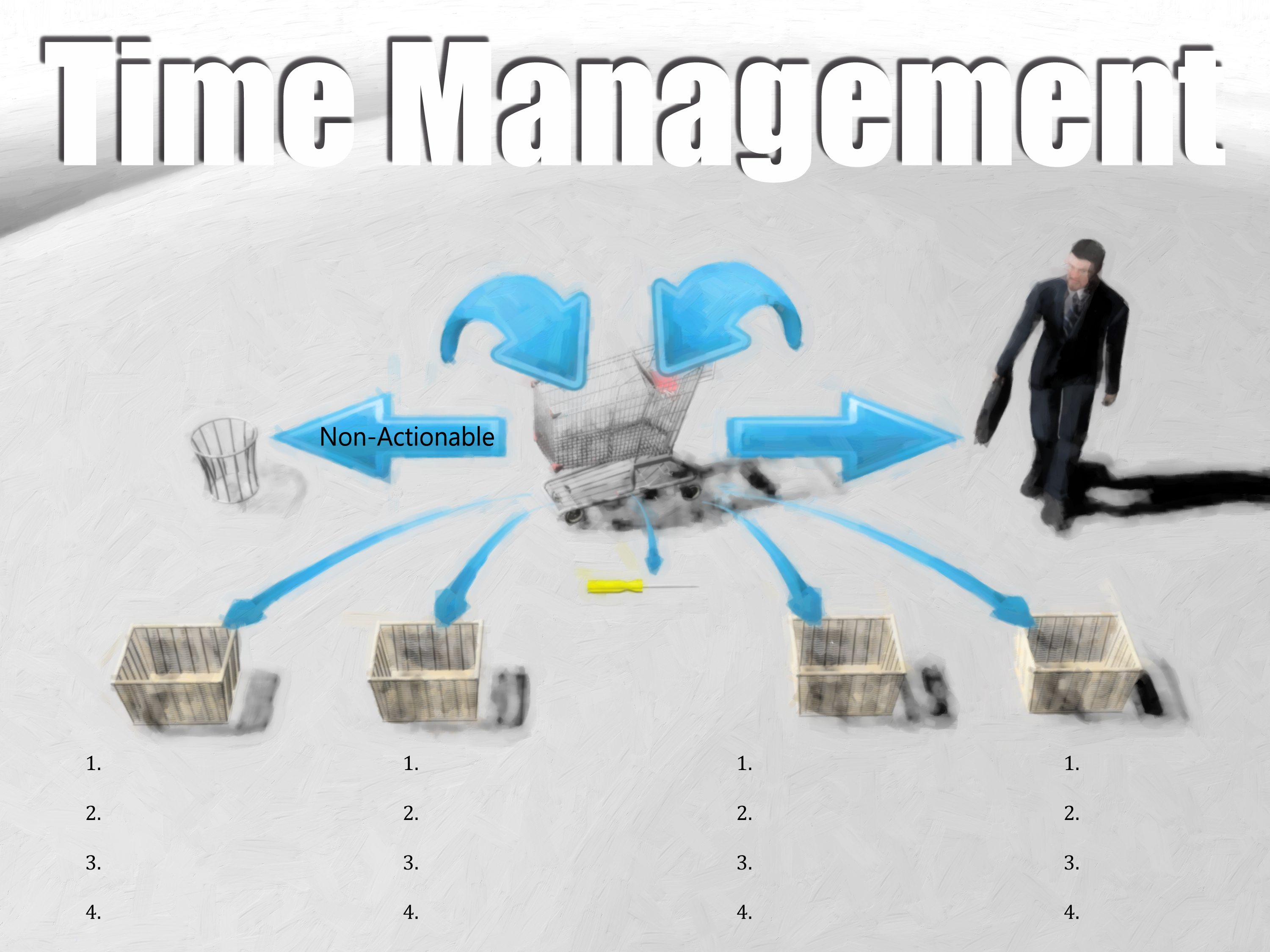 I’ve often worked off of a “to-do” list, but I’ve found that to-do list to be quite unwieldy. Allen said that basically when things come into your grocery cart (all those things that you have to do), they can be delegated one, two, three, four ways.