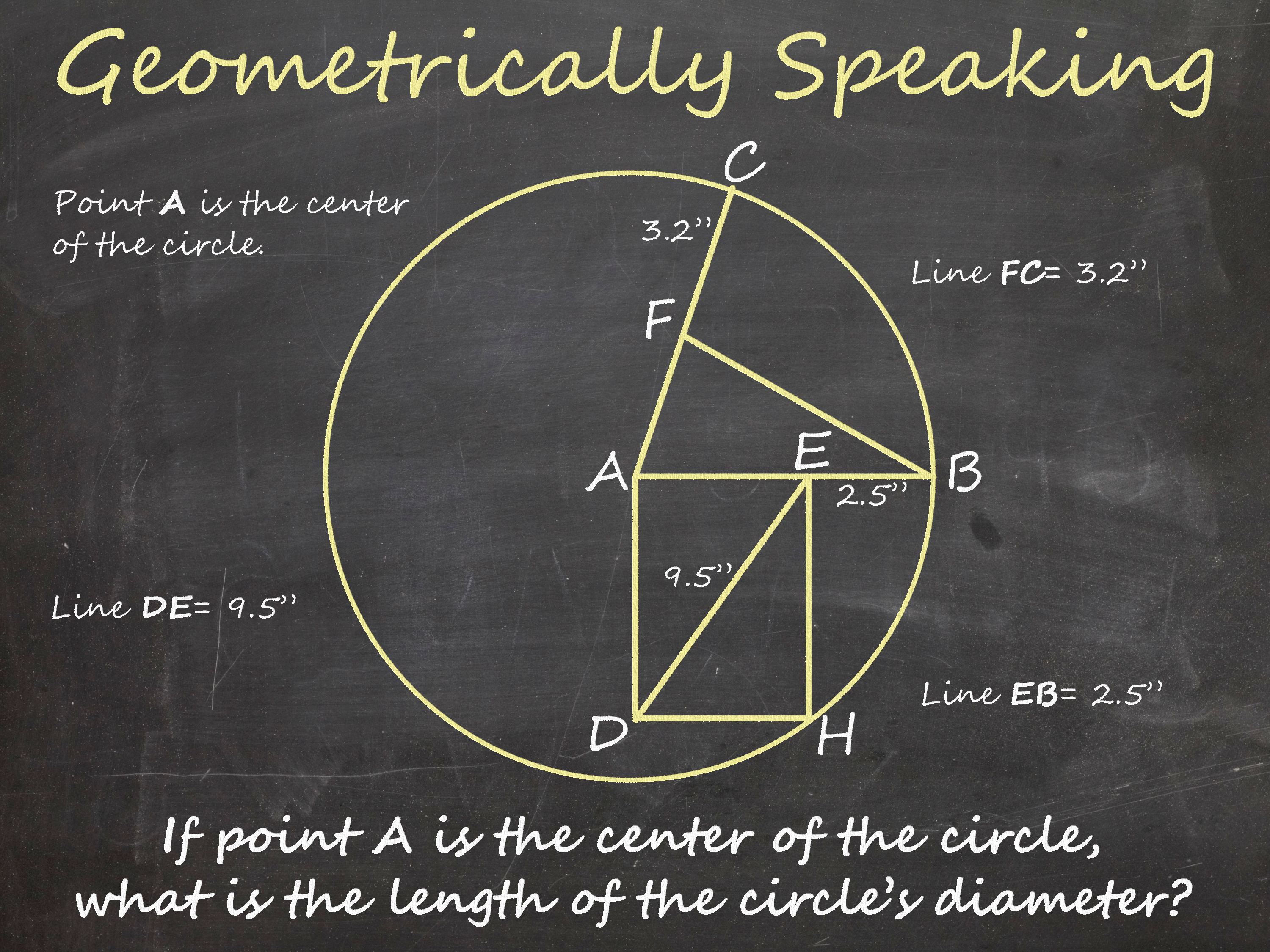 If you don’t panic at the thought of mathematics, solving the brainteaser in this poster is really quite simple. If line DE is 9.5″, then line AH would be 9.5″ and the diameter of the circle would be 19″.