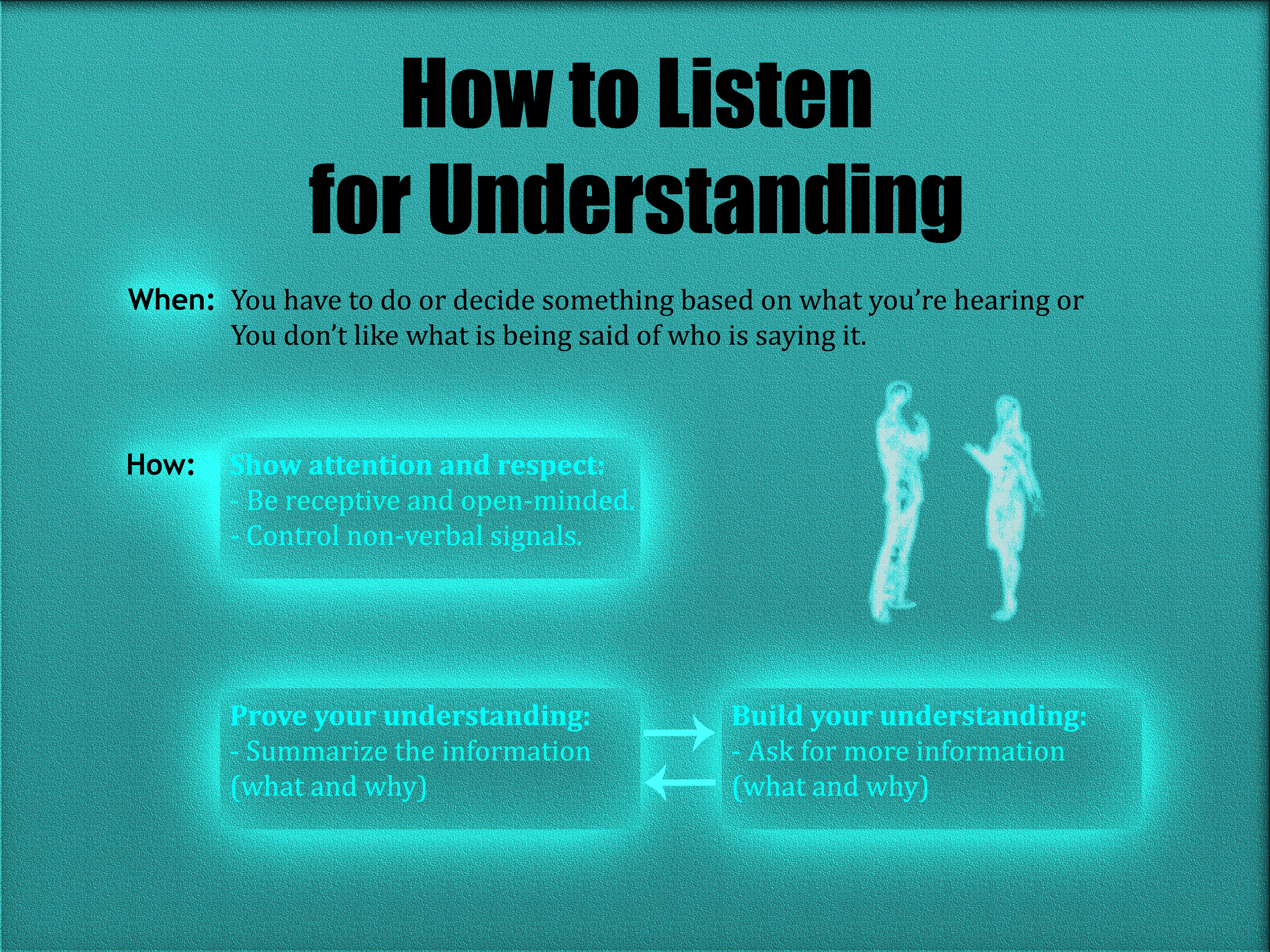 S/he know how to listen for understanding. This poster shows the process in a simple graphic fashion. After showing attention and respect particularly through the management of his/her non-verbal signals, the leader then summarizes or paraphrases back what s/he’s heard to prove their understanding and then builds their understanding through additional questions when required.