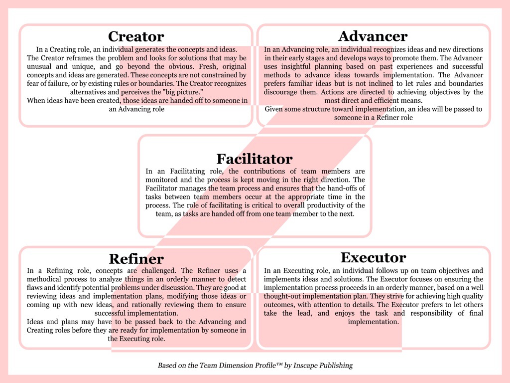 On a team functioning at peak efficiency, there typically is also a Facilitator keeping the process running smoothly so the project doesn’t get stuck with a Creator who refuses to stop creating or a Refiner who is never satisfied with the extent of his/her refinements.