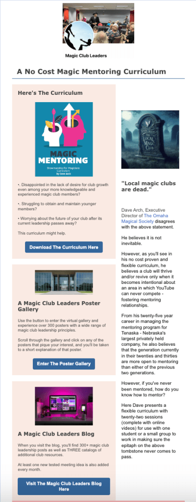 A proven and flexible magic club mentoring curriculum to build the leadership bench strength of a local magic club and continue to intentionally develop younger members; entrance to a magic club leadership poster gallery with over 300 leadership principles depicted in posters; and access to a constantly expanding magic club leaders blog with at least one new and tested meeting idea added every month.