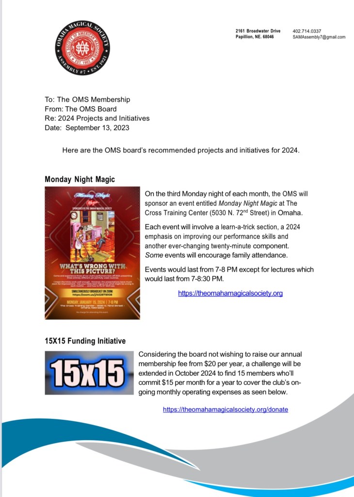 Those goals are released to the membership prior to our 15×15 annual fund raiser in October so those members who choose to give financially know what their money is going towards over the next twelve months.