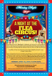During the event, between the pre-event selected performers demonstrating and explaining the tricks they’ve selected, our raffle is held, a magic trick is taught (https://vimeo.com/301056763/c1df61adf6), and a flea circus manuscript is distributed to each attendee (https://www.lybrary.com/flea-circus-p-193078.html) and skim through the manuscript – sharing with their table mates what they initially find interesting in the booklet.